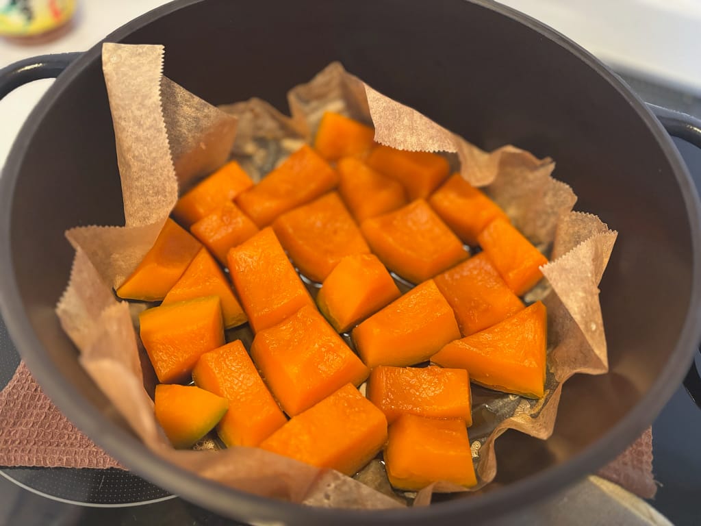 かぼちゃ煮はクッキングシートを敷き、大さじ2程度の水と調味料を入れて加熱するだけで出来上がり。