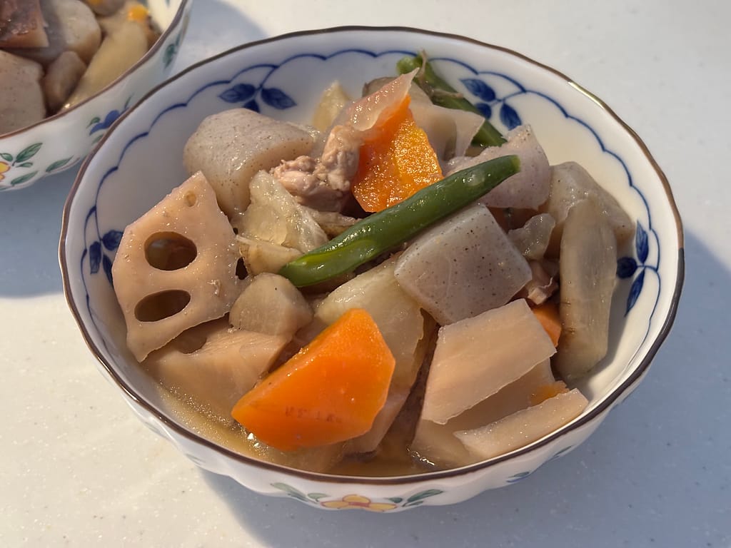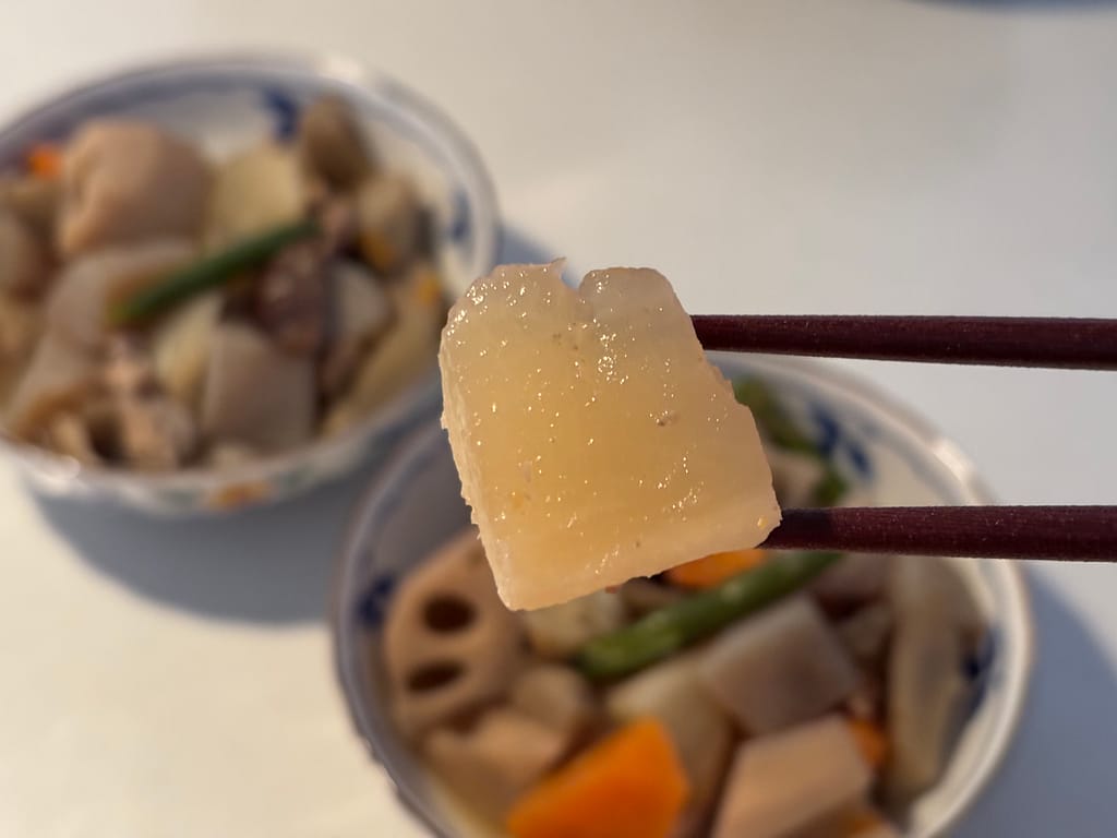 筑前煮の出汁をしっかり吸い込んで、じゅわっと味が染みていました。