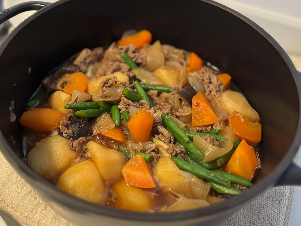以前、無水で肉じゃがを作りましたが、じゃがいもがほくほく&牛肉は柔らかく仕上がり最高でした。