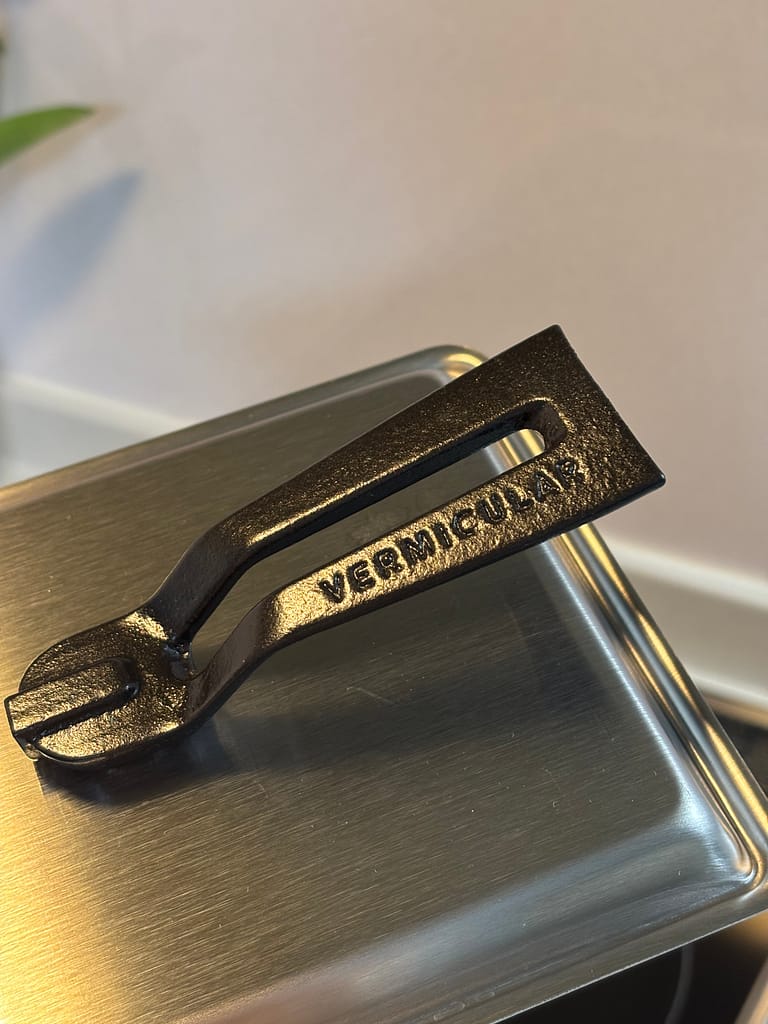 蓋の持ち手にはバーミキュラの刻印があり、高さも十分あるので食材を選ばず使えそう。見た目も美しくて、眺めているだけでうっとりしてしまいます。
