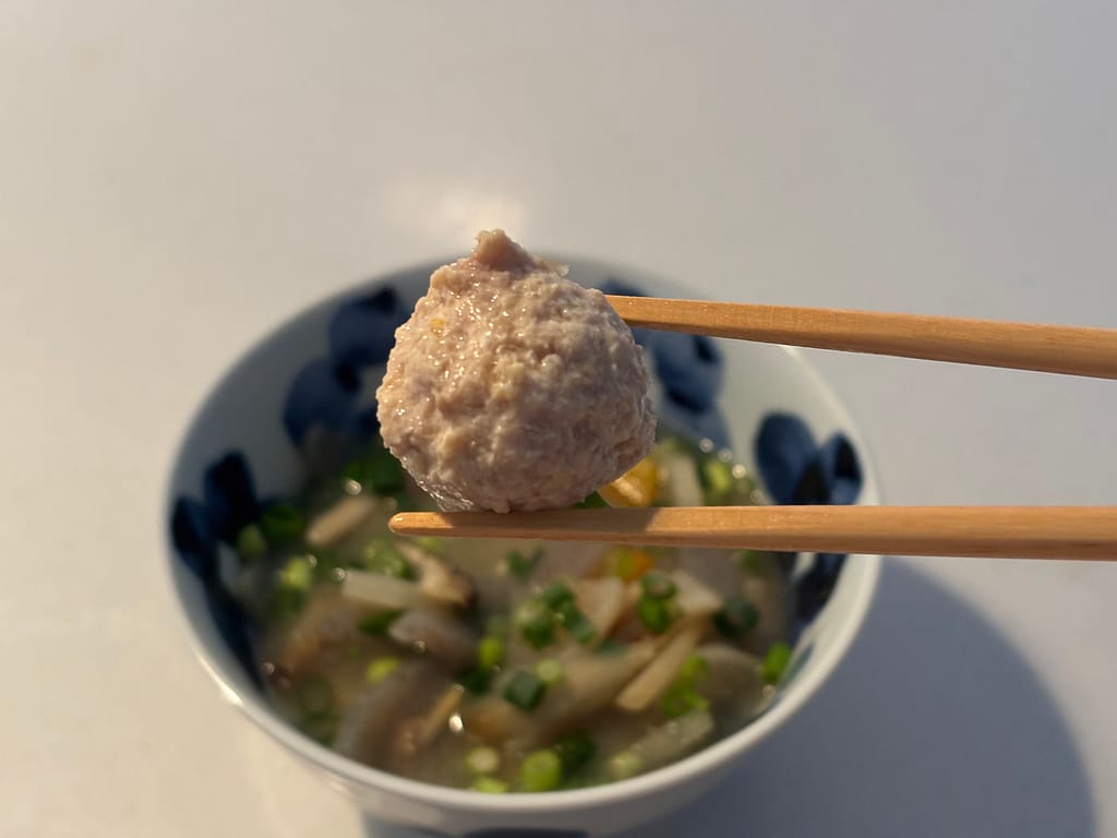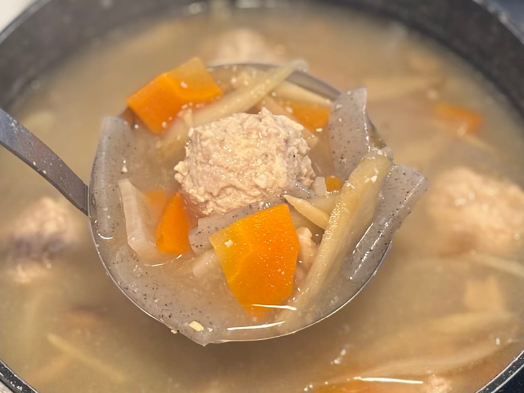ごぼう、大根、人参、こんにゃく、しめじ…そこに鶏団子が入って、食べ応えもしっかり