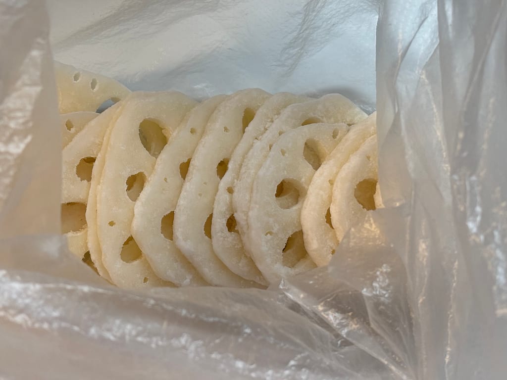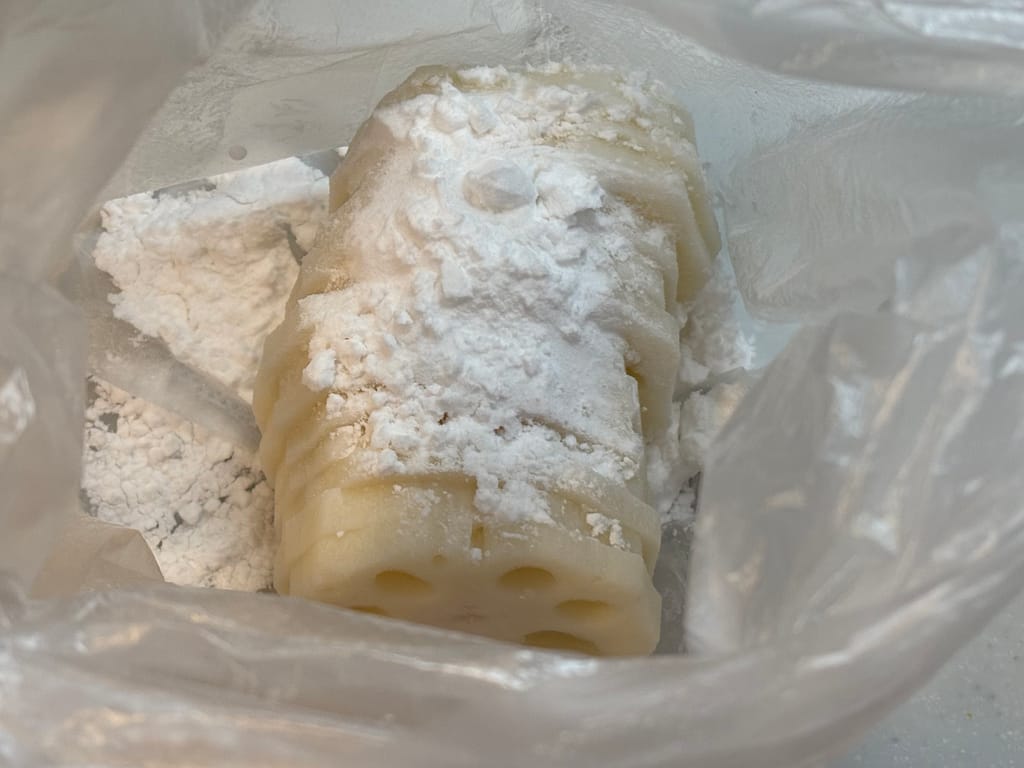 れんこんは 薄くスライスして片栗粉をまぶす のがポイント。