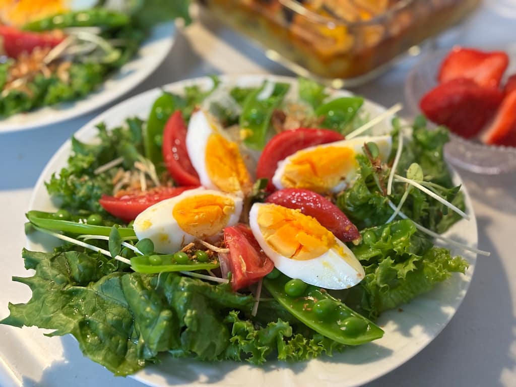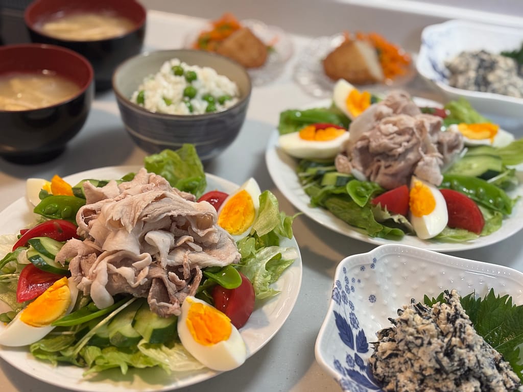 白和えもグリンピースご飯も主役級のおかずなので、メインはあっさりとした豚しゃぶサラダに。
