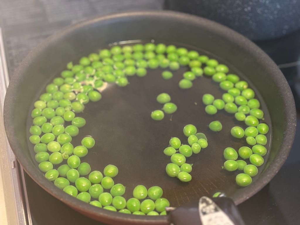 ① グリンピースを塩小さじ1/2を加えた熱湯で約3分茹でます(豆がしっかり浸かる量の湯を用意)。