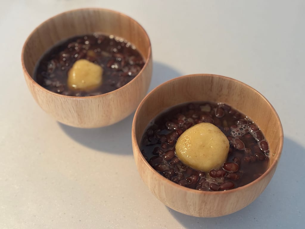 - さつまいも入りのお団子を浮かべれば、お月様みたいな十五夜ぜんざいに。