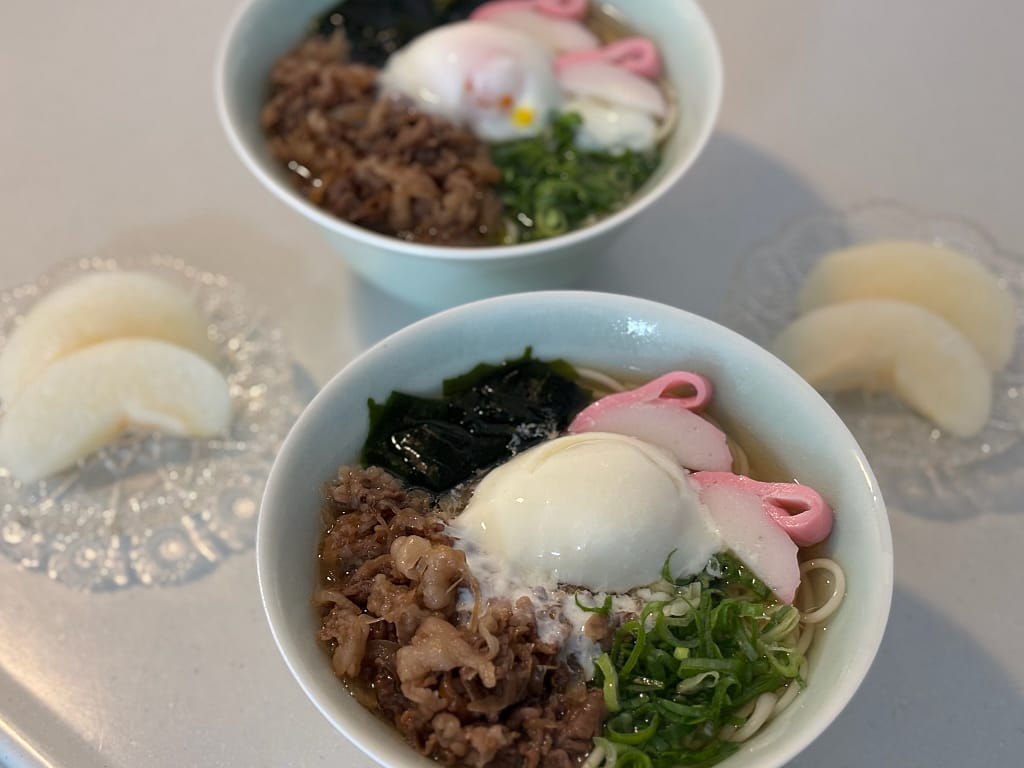 ちょっとした一手間でお月見仕様に仕上げたうどんですが、お月見の雰囲気だけでなく、温泉卵のまろやかさと牛肉のコクが楽しめる一杯になりました。