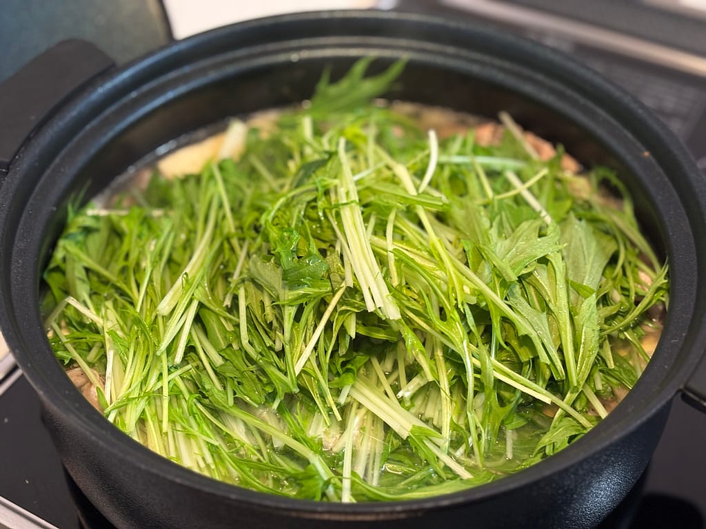 鍋に水とだしパックを入れて煮出し、白ねぎと豚肉を加え、火が通ったらレタスや水菜を加えるだけ。