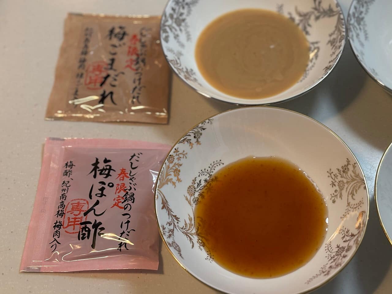 梅ぽん酢は梅酢を使用してさっぱりとした味わい、梅ごまだれは濃厚な練りごまに紀州南高梅の梅肉を加えたほんのり甘酸っぱい風味。