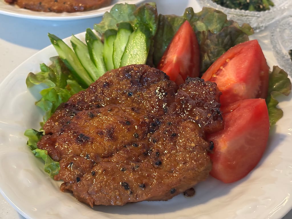 味噌、砂糖、醤油、黒胡麻、ニンニクでしっかり味がついています。