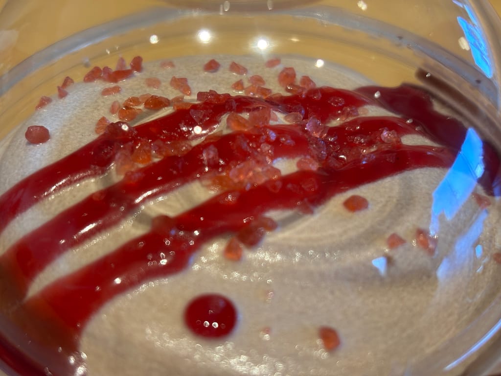 レッドベリーグラサージュ:赤いベリー系のフルーツピューレを使い、砂糖やゼラチンなどでとろみをつけた艶やかで甘酢っぱい赤いコーティングソースのこと
