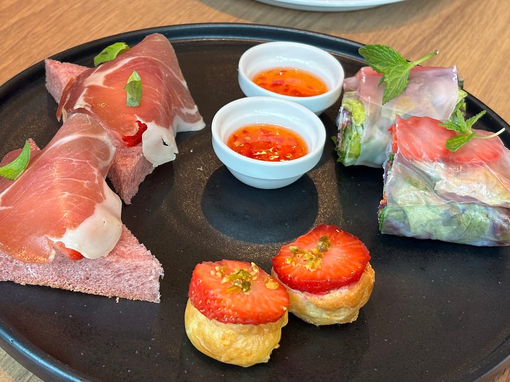 彩り野菜といちごが絶妙にマッチ。スイートチリソース付き