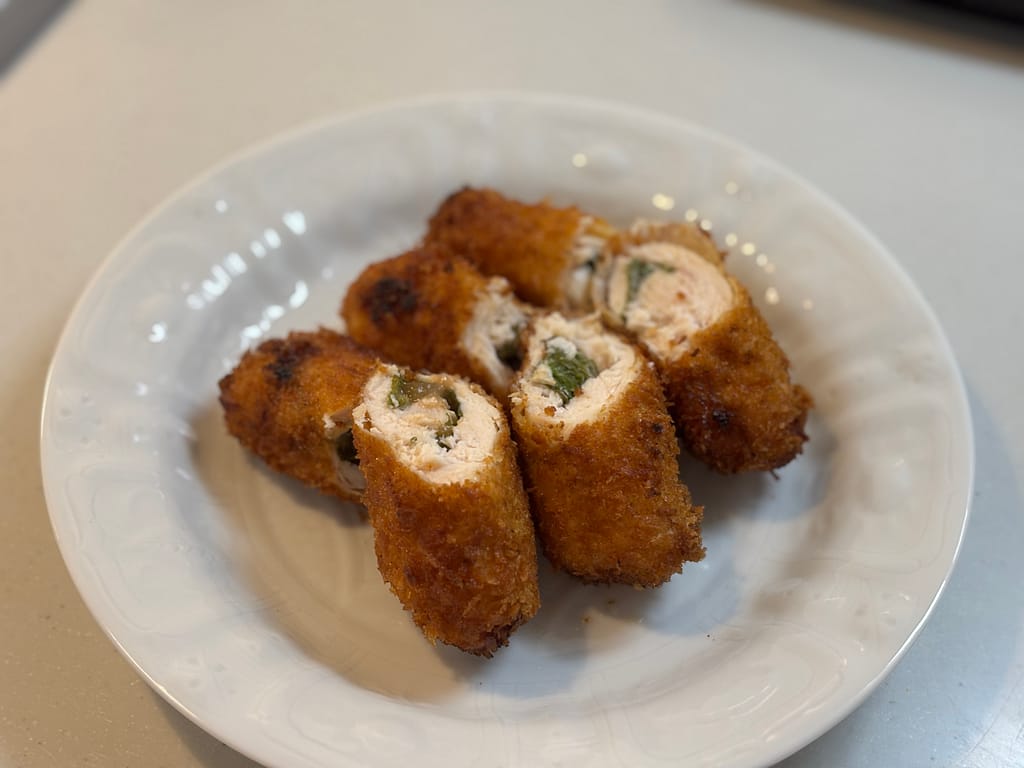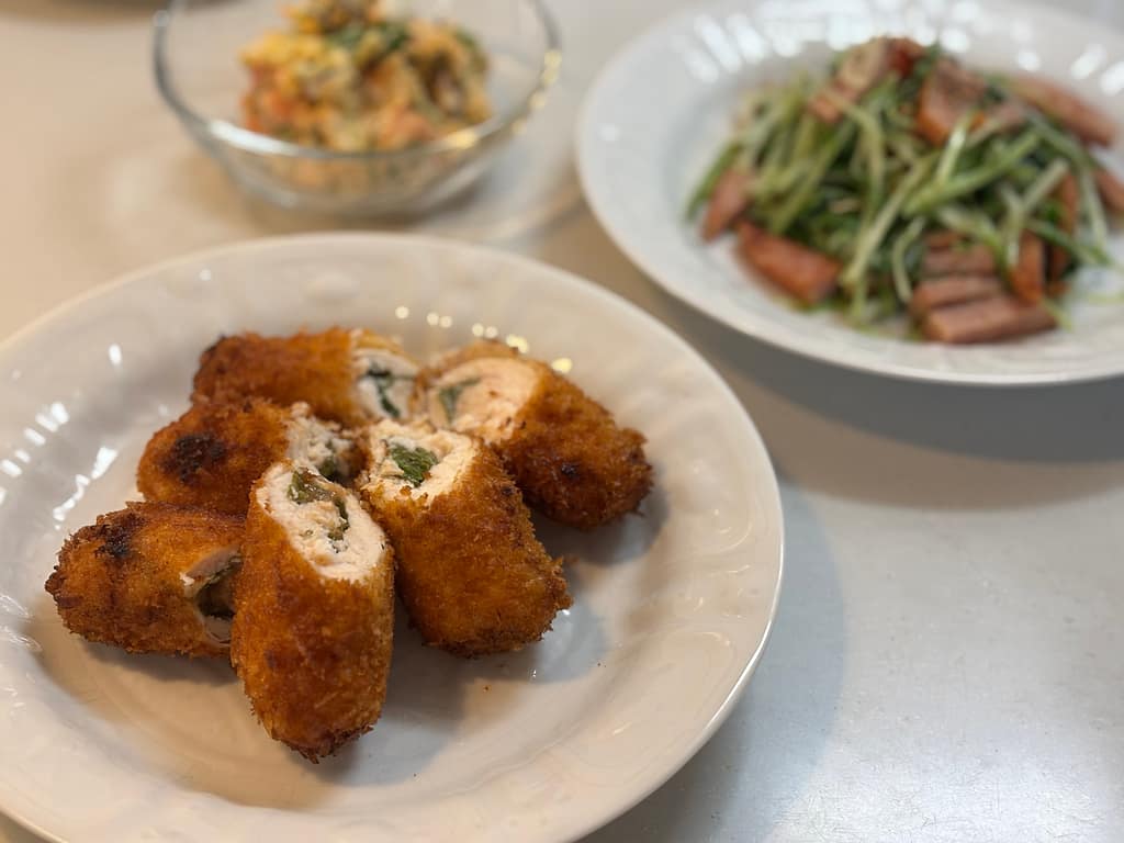 青じそと梅の香りが広がる、さっぱり美味しいささみフライの出来上がりです。