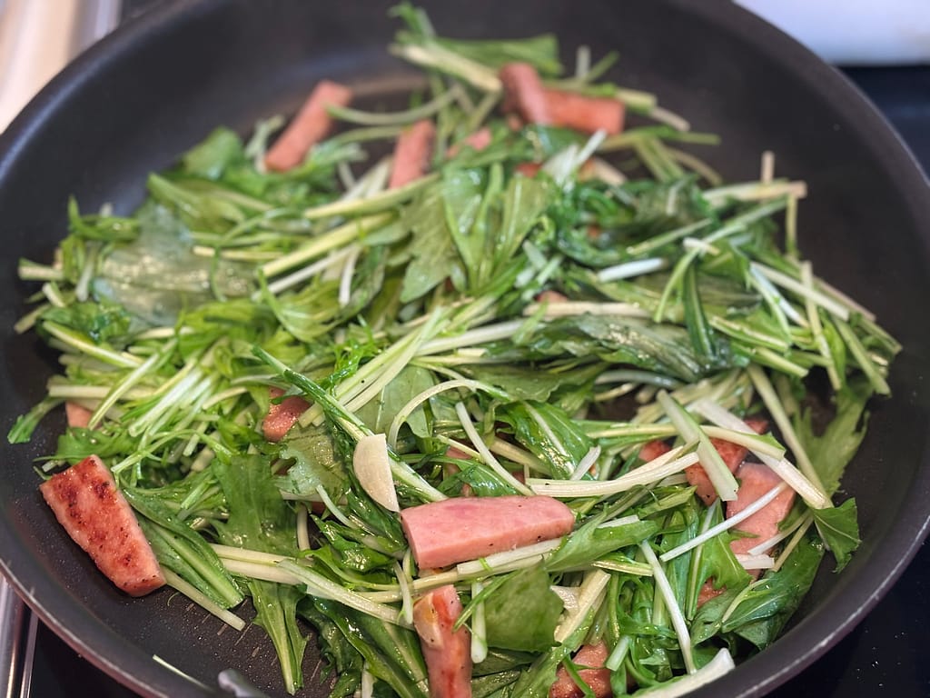 2. ベーコンを加えて炒め、一口サイズに切った水菜を加える。