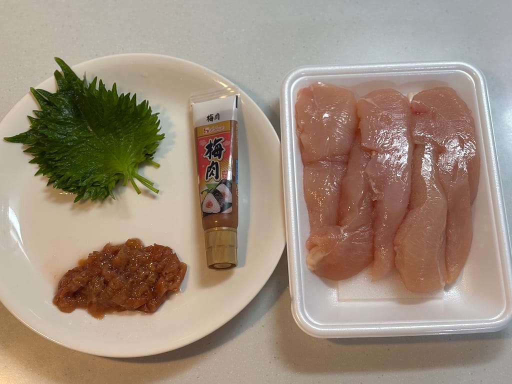 とりささみ、塩麹、青じそ、梅チューブ、はちみつ梅、小麦粉、卵、パン粉