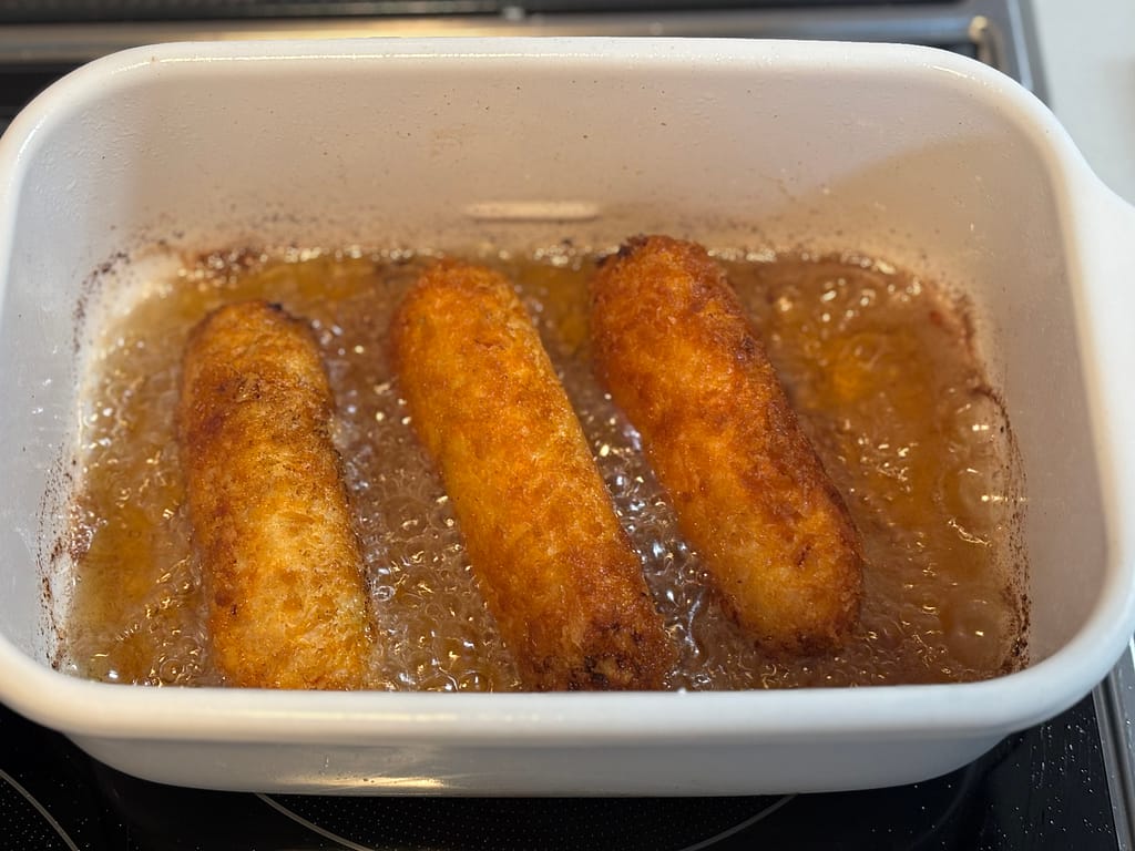 170~180℃に熱した油で、衣をつけたささみを揚げる。