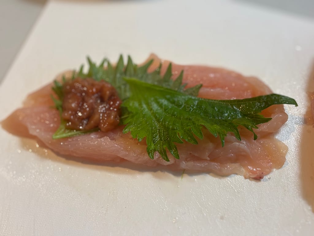 ささみの上に青じそを1枚のせ、梅チューブを少量絞り、さらに刻んだはちみつ梅をのせる。