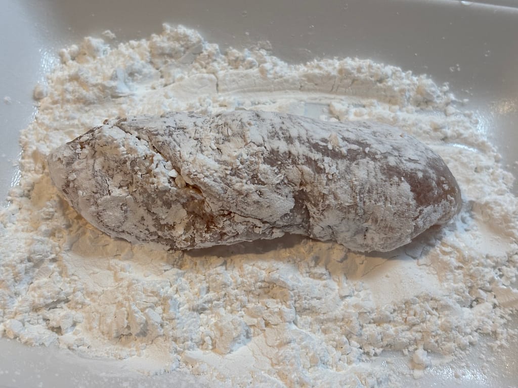 巻いたささみに小麦粉を薄くまぶし、溶き卵にくぐらせてパン粉をまぶす。