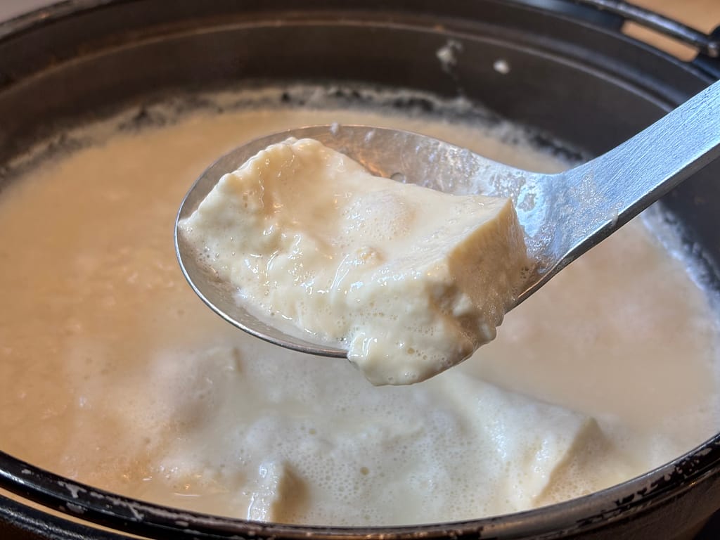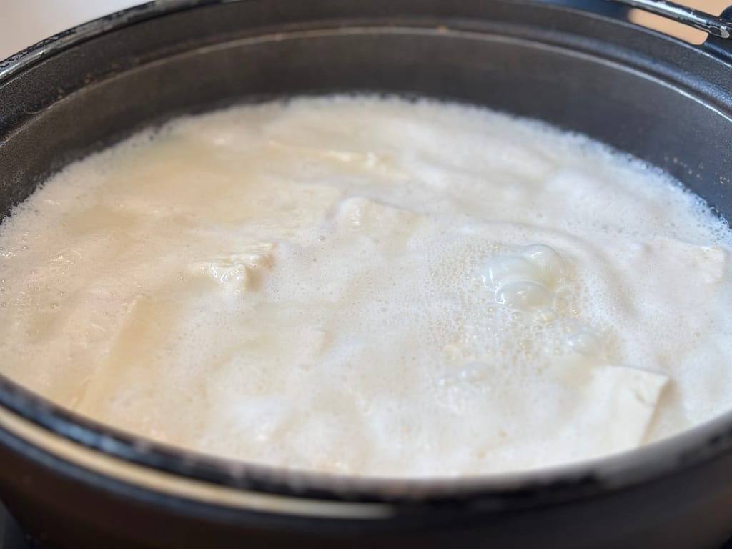 平川屋特製の豆腐を鍋に入れ、水と一緒に強火で10分ほど煮込むと、鍋全体が白濁し、豆腐の角が取れてトロトロに。