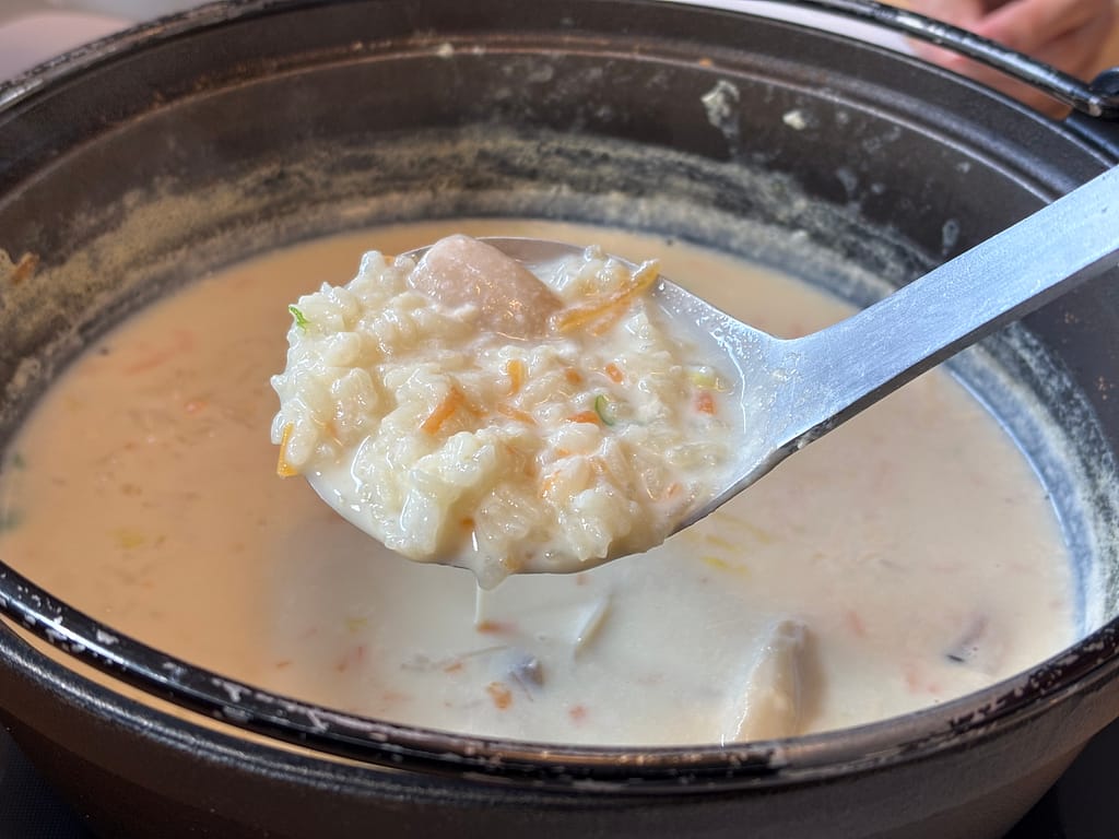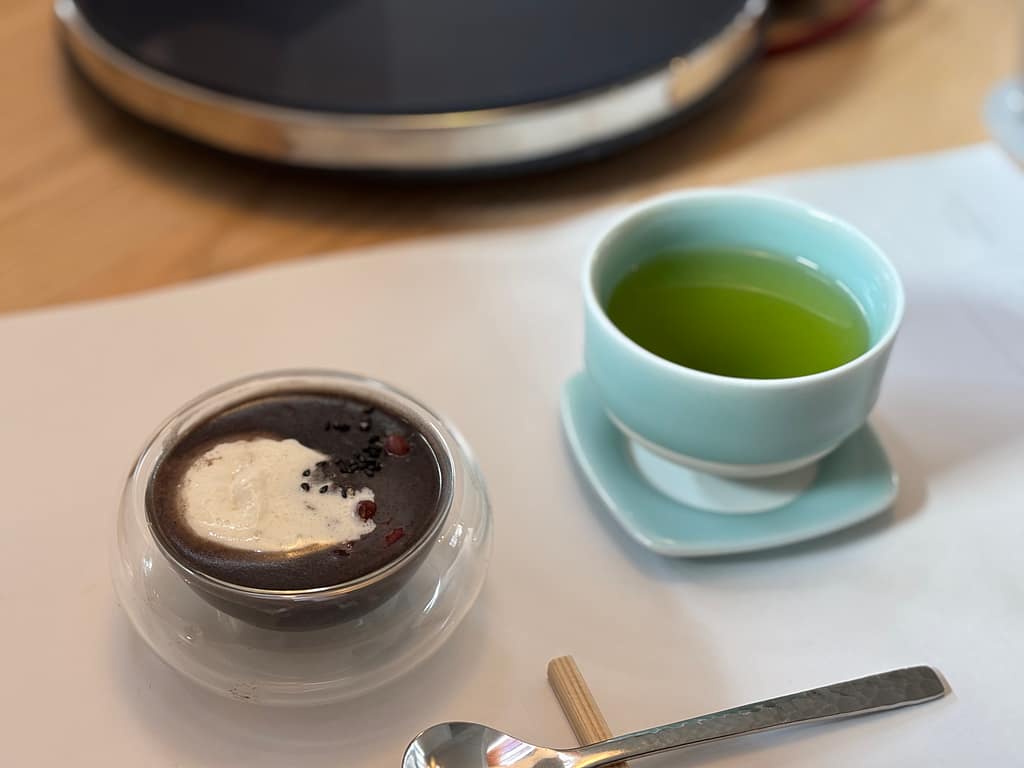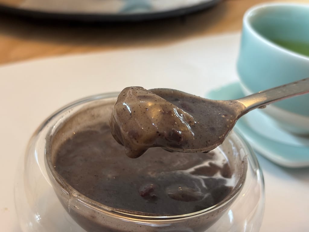 雑炊を食べ終わった後のデザートは、豆乳もちのぜんざい。