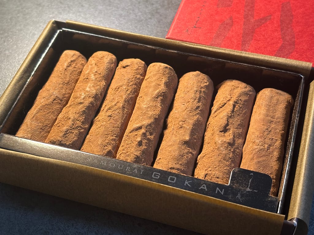 以前X(旧Twitter)の投稿で見かけてから気になっていた商品です。公式サイトには「練り上げたチョコクリームを棒状に絞り、ミルクチョコレートでコーティング、さらにココアを添えて仕上げた」との説明があり、その言葉通りの繊細なチョコレート。